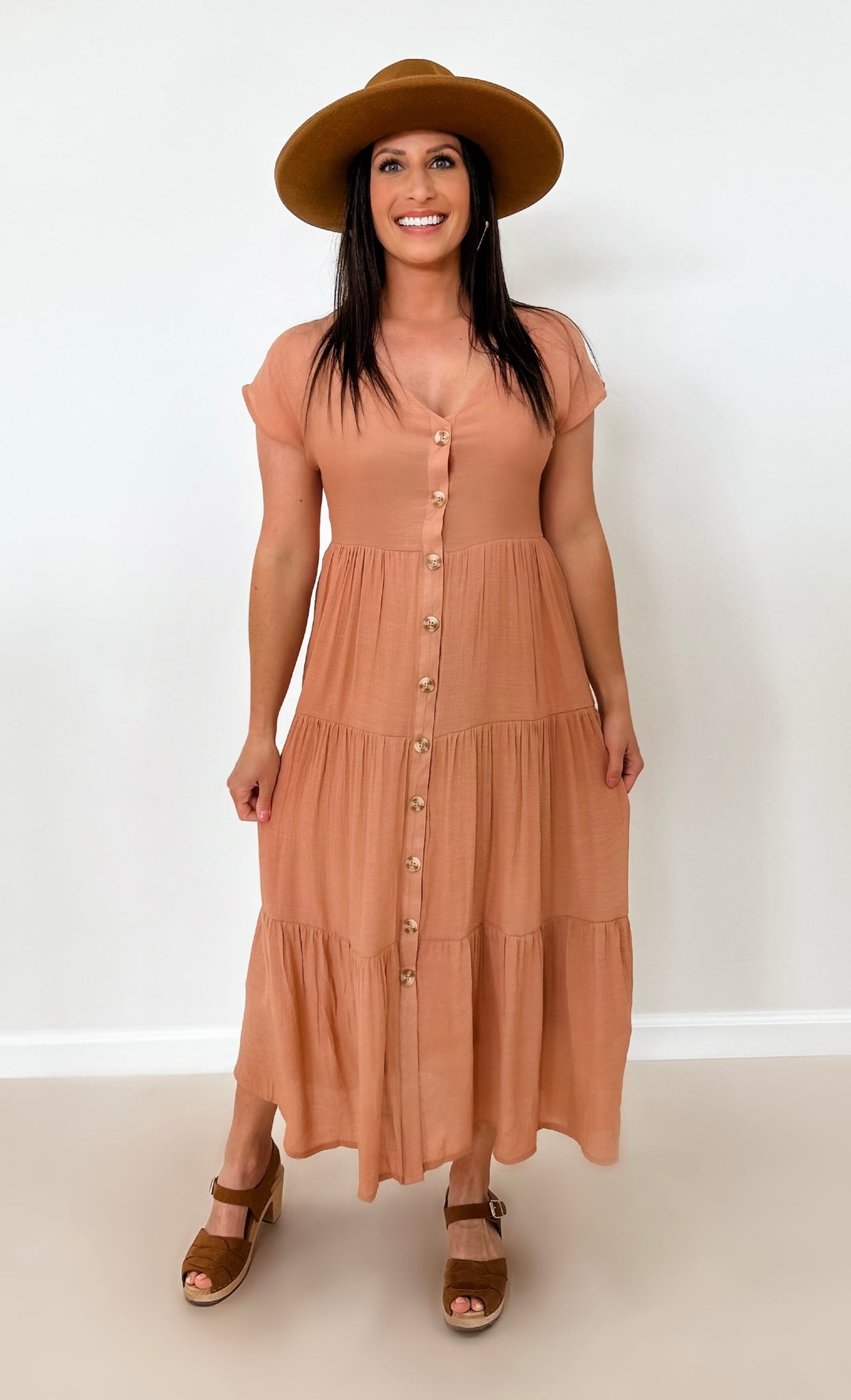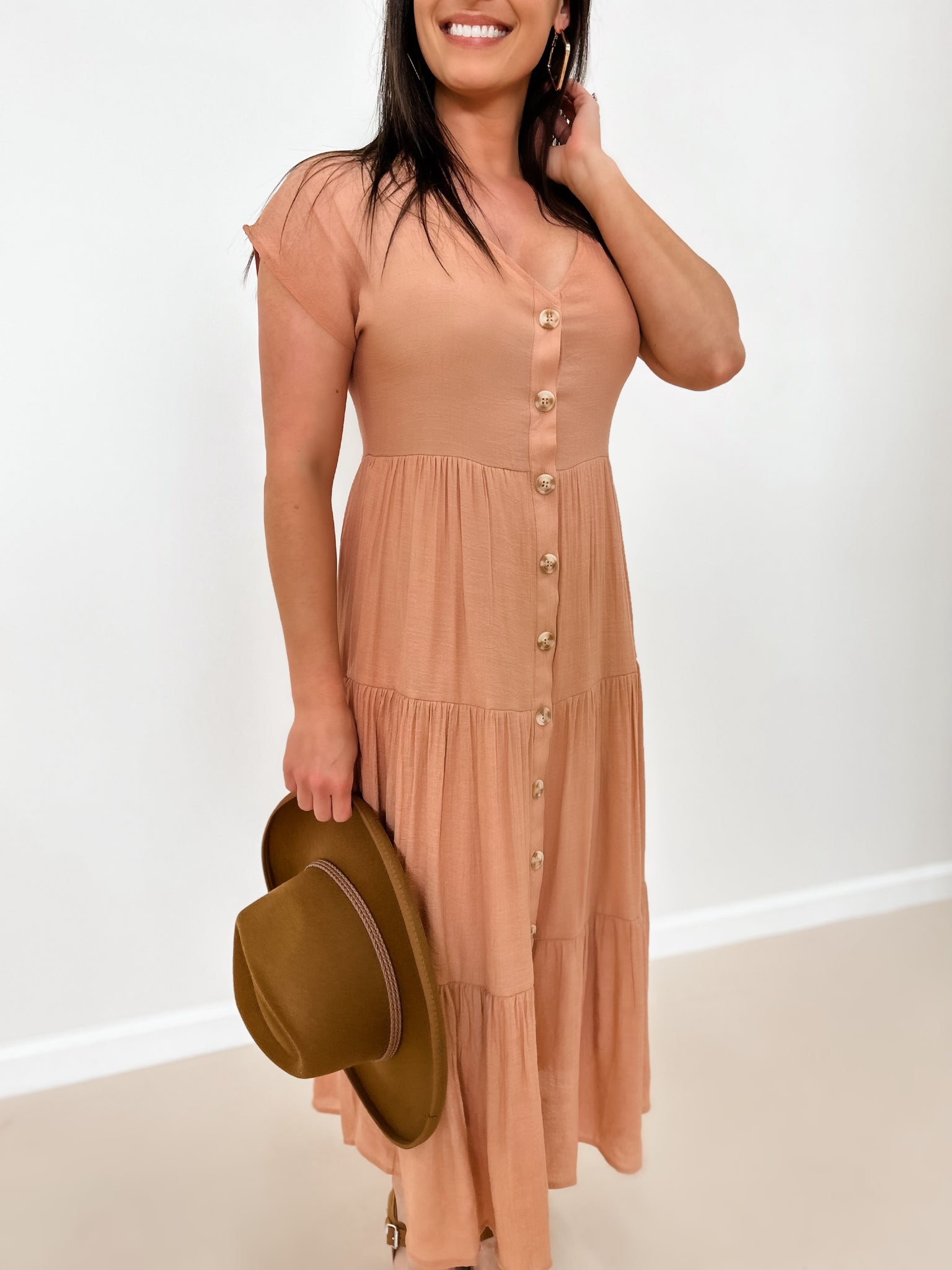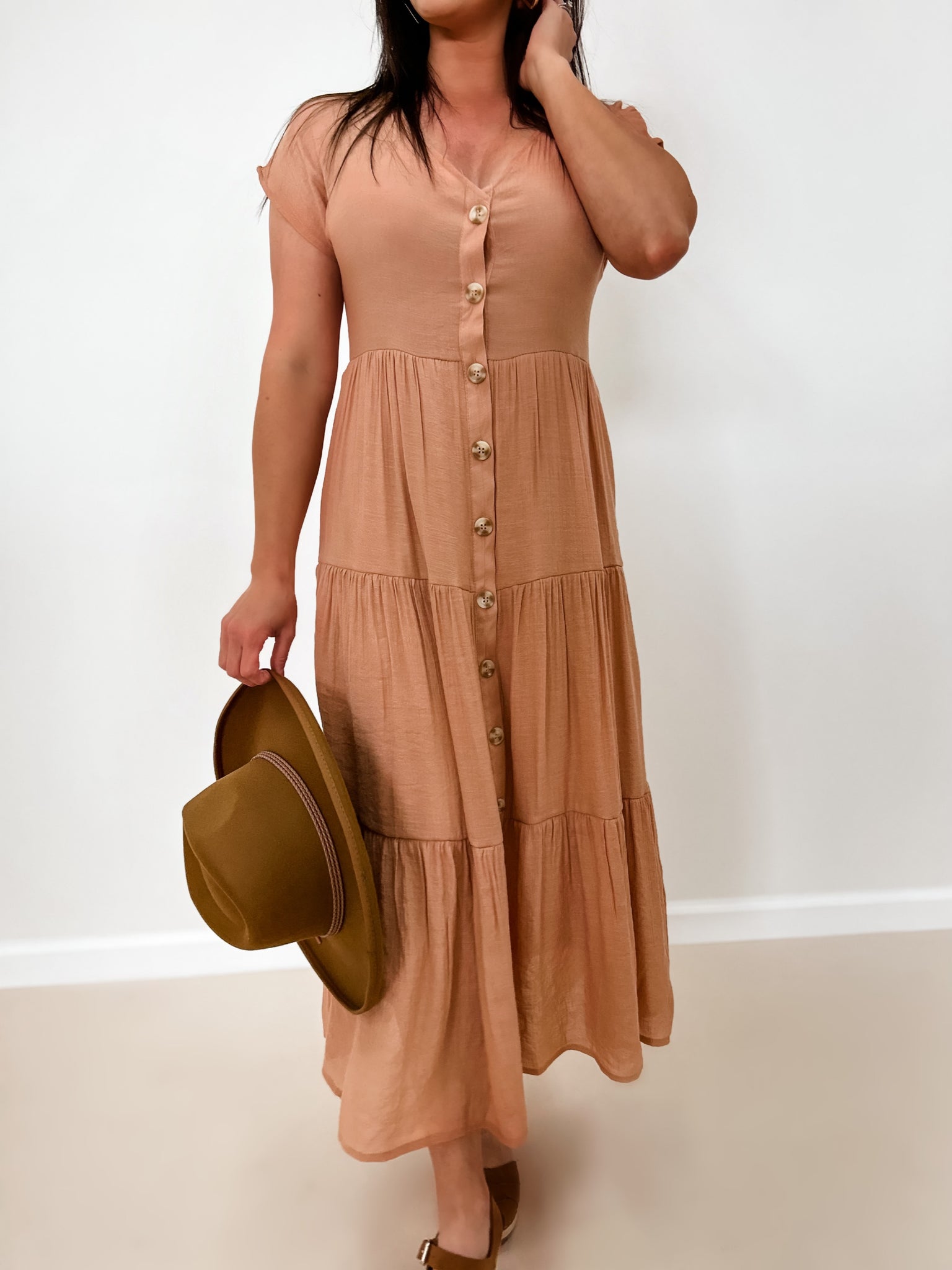 A sienna midi dress featuring a v-neckline, short cap sleeves, front non-functional tan buttons and tiered skirt. Partially Lined.