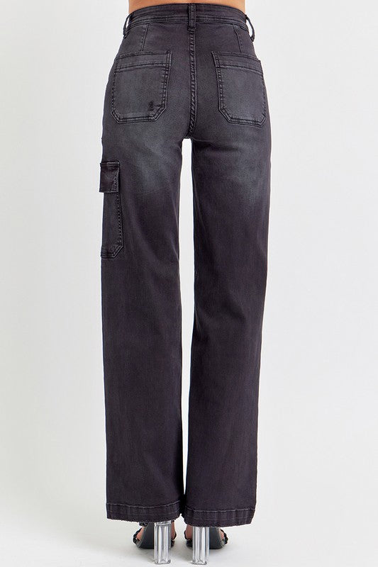 Black stretchy high rise wide leg cargo jeans featuring zipper fly and button closure, back patch pockets and cargo side pockets.