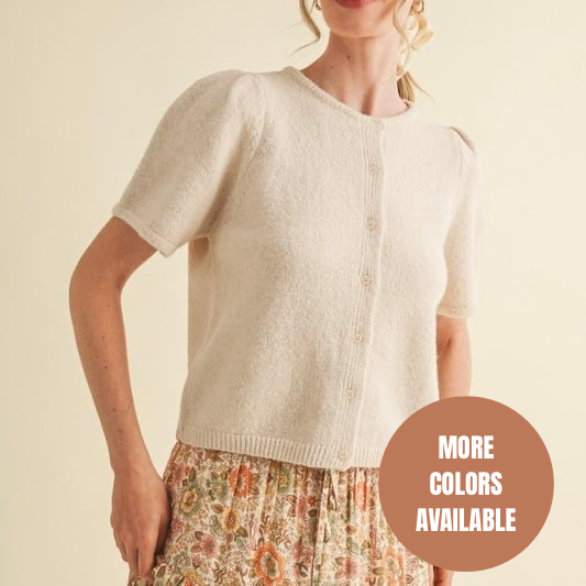 A cardigan sweater top featuring short puff sleeves with buttons down the front, ribbed round neckline and ribbed hem.